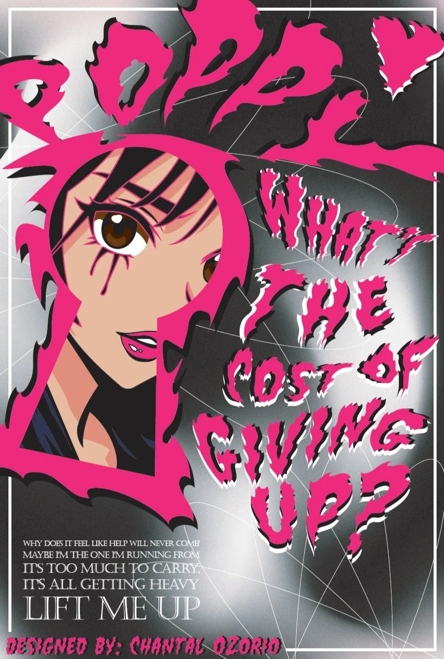 this piece was part of the digital printing technologies course (gcm 320), where i explored print embellishments using the ricoh c7210x press. inspired by one of my favourite music artists, poppy, i created an original poster for her latest album, negative spaces, using neon pink as the primary fifth colour toner. the theme of the design centers around the song the cost of giving up.